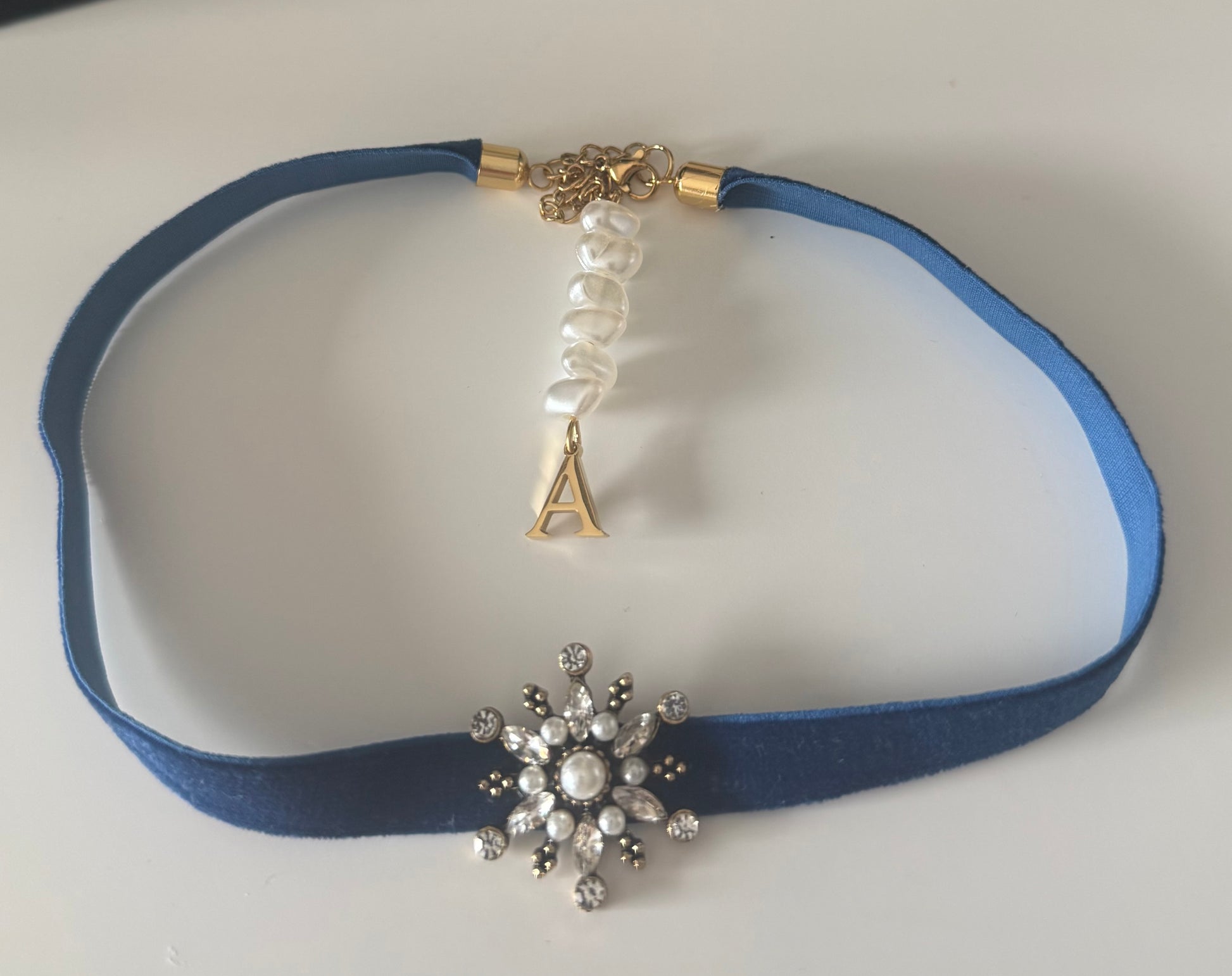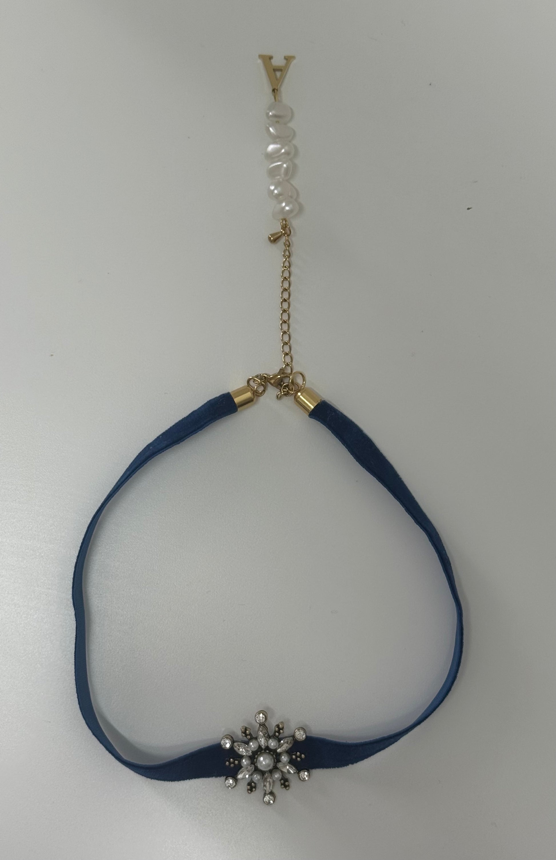 Chóker mini de terciopelo y estrella fantasía. Detalle colgante perlas e inicial en cierre.