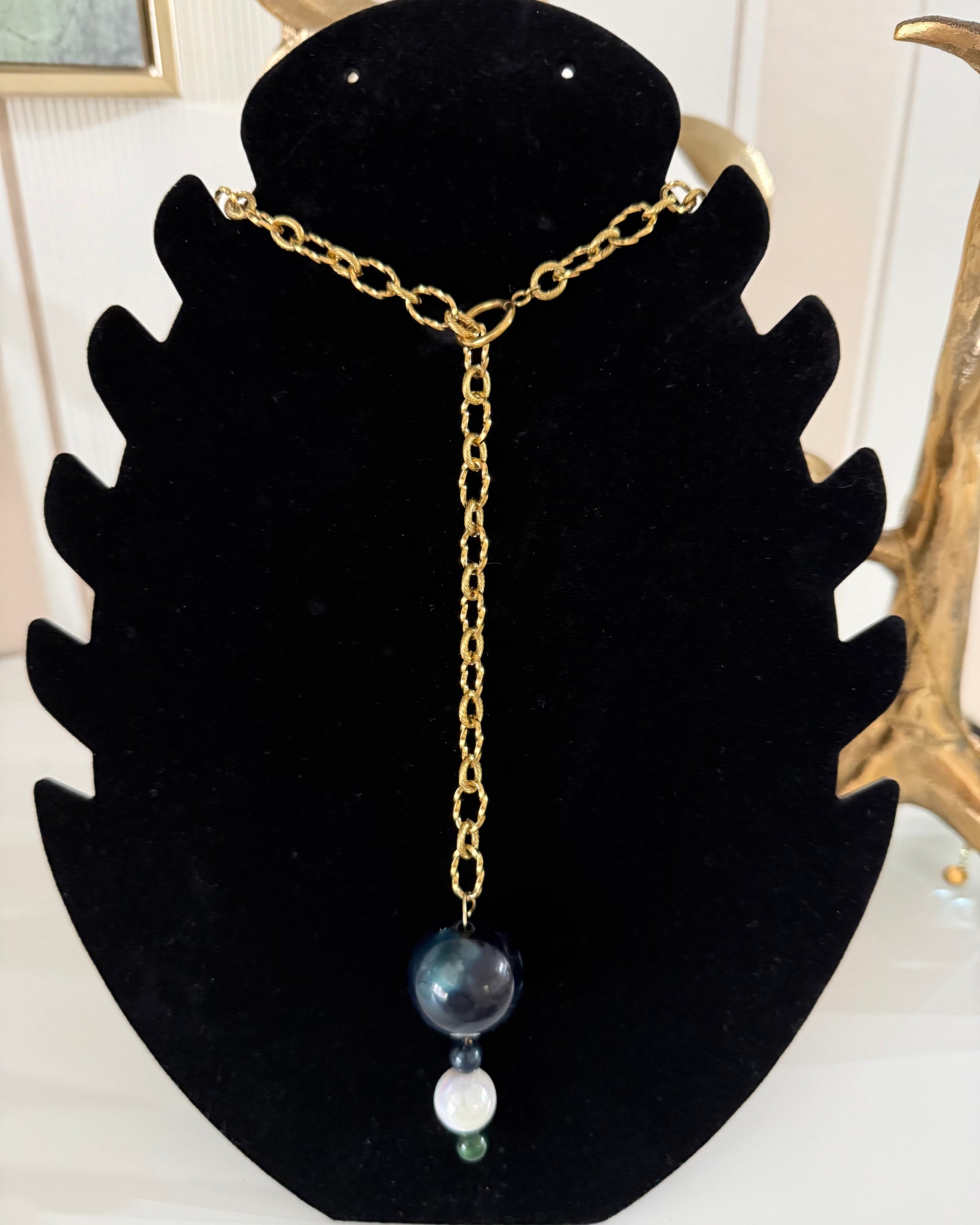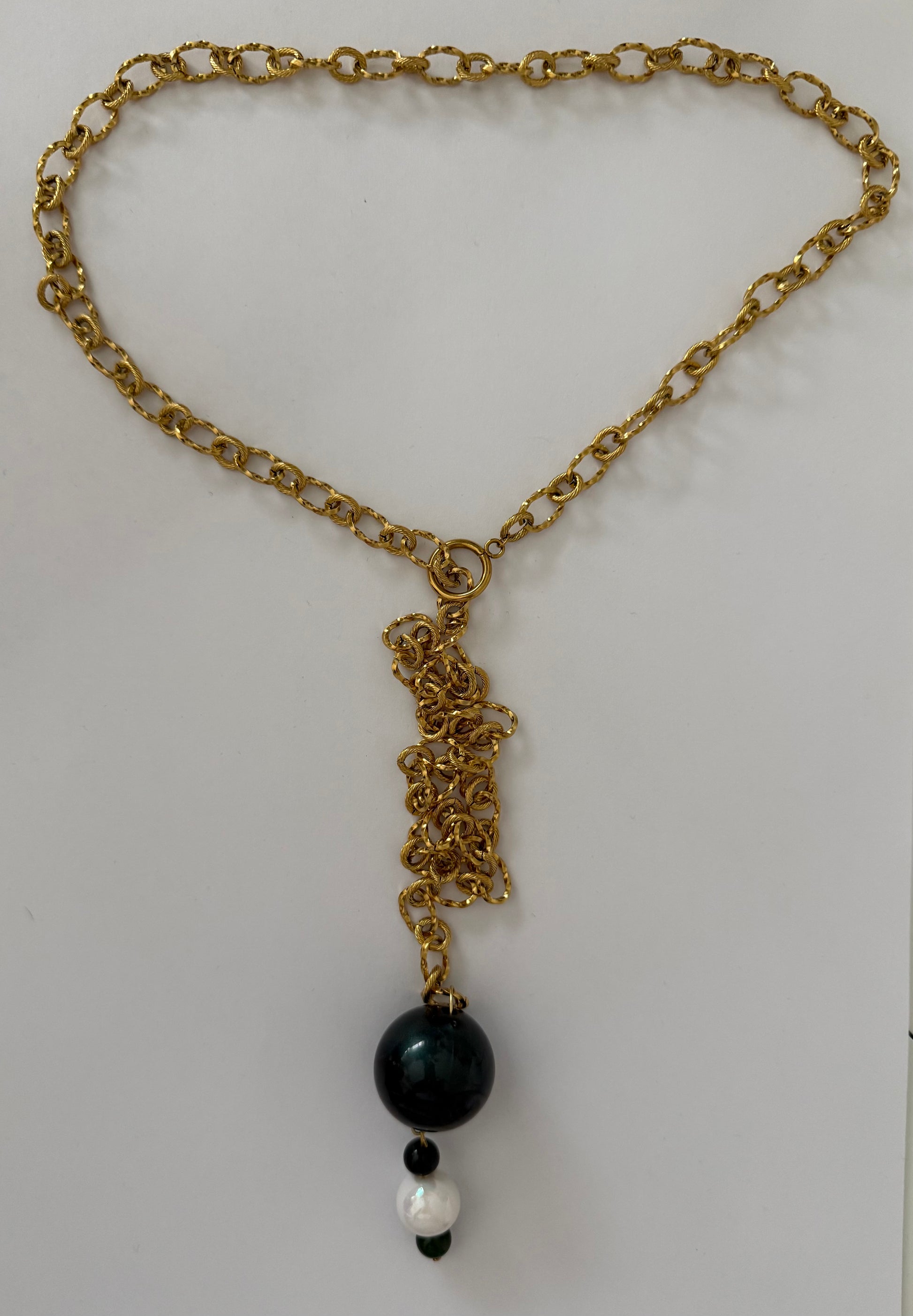Collar con cadena de acero inoxidable y perlas nacaradas de distintos tamaños. Varios posiciones. Piezas que favorecen y te harán sentir especial.